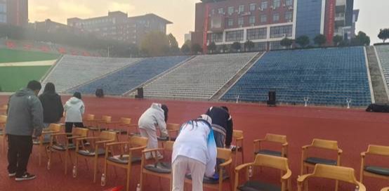 次日天微亮,当校园还笼罩在晨曦之中,学院组建的“分水小队”已迅速集结。志愿者们各司其职,有条不紊地开展运水、搬水、擦去桌子晨露等工作。将饮用水精准分发到领导席及各个工作岗位,及时为清晨忙碌的工作人员和参赛选手送去便利。从夜间的现场布置到清晨的物资保障,我院师生用实际行动诠释了“责任担当”与“团结协作”的精神。
