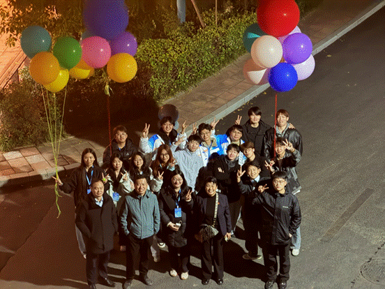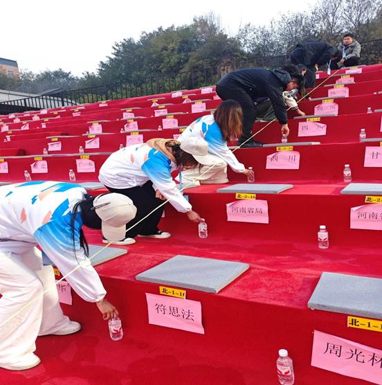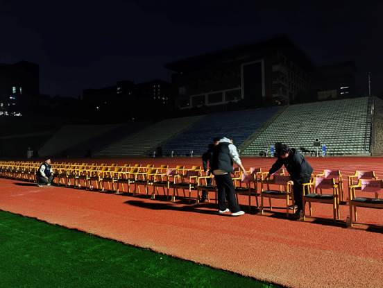色彩鲜艳的气球在现场错落有致排列,为竞赛营造出热烈庄重的氛围。尽管工作持续至深夜,在场全体志愿者始终以饱满的热情投入其中,确保现场布置高标准完成。