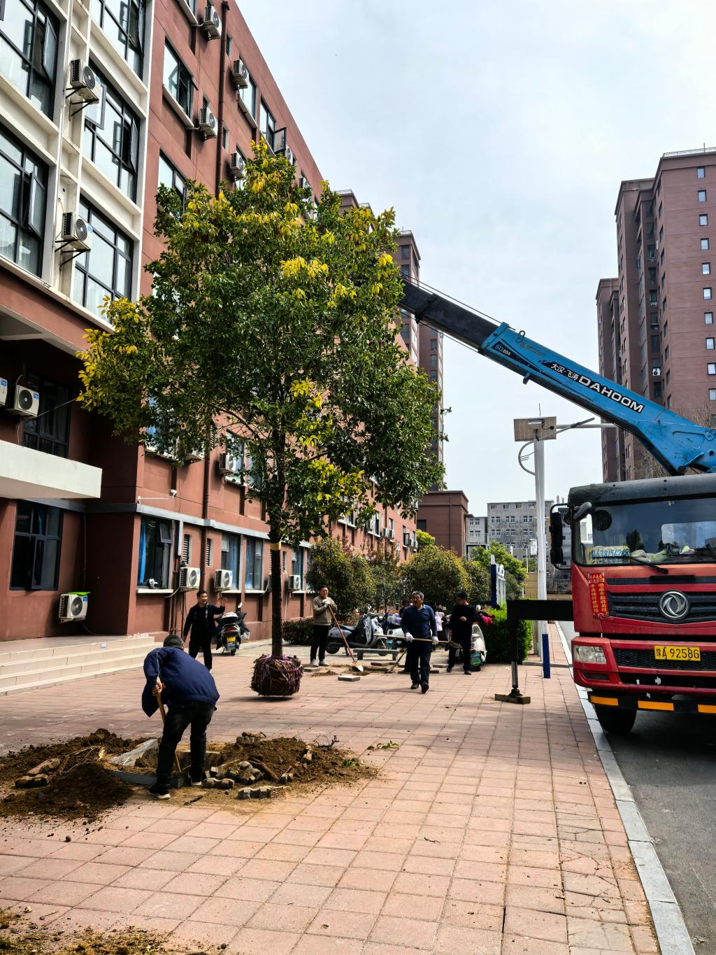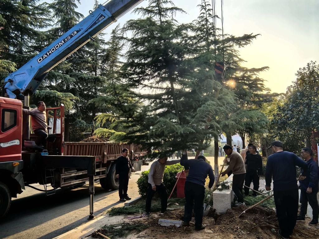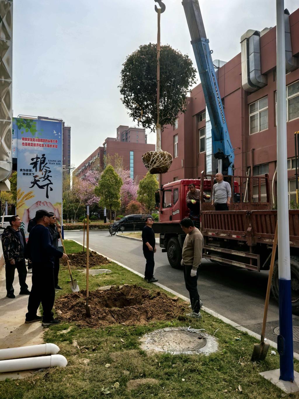 在一号宿舍楼前,工作人员遵循专业规范,科学移植香樟,带土挖掘、修剪加固,精心呵护每一株苗木。香樟四季常青、清香驱虫,为师生休憩空间增添生机,更传递常青向上的育人意境。