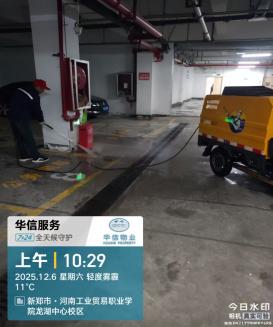 入驻后第一时间完成车库全域摸排,精准梳理卫生死角、设施隐患、制定“分区域、分步骤、人机协同”的专项整治方案,统筹保洁、工程等多部门力量,明确责任分工,采用“高压冲洗+人工精细化清扫+专业养护”的全流程作业模式:出动高压冲洗车对车库地面、立柱、边角、排水沟进行全域冲洗,强力清除积尘、油污、杂物;安排专人对车位缝隙、管线底部、消防设施周边等冲洗盲区进行人工清扫,彻底铲除顽固污渍;对地面磨损、污渍区域进行专业药剂养护与翻新处理,还原车库洁净底色。