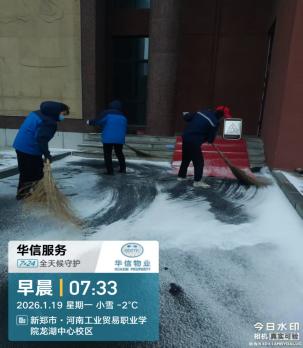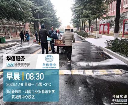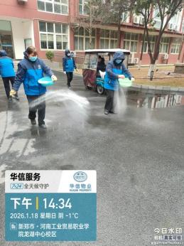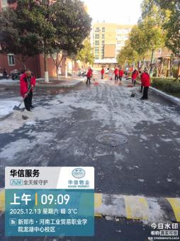 降雪初期,第一时间组织人员对校园主干道、桥梁坡道、楼宇台阶、地下车库出入口等易结冰区域,提前撒布融雪剂、工业盐,通过化学融雪延缓积雪结冰,为后续人工清雪争取时间,从源头降低通行安全风险。全员上阵,全域清雪保畅通。降雪期间及雪后,华信物业全员上岗,以“雪停路净”为目标,开展全域除雪攻坚:重点区域优先清:清理师生上课必经之路、教学楼、宿舍楼出入口、食堂周边、校园主干道等核心区域,确保师生出行安全;人机协同提效率:采用“人工清扫+机械辅助”模式,人工精细化清理台阶、边角等盲区,机械快速清扫主干道积雪,同步对清理后的路面再次撒布融雪剂,防止夜间结冰;作业全程设置安全警示标识,安排专人巡查路面结冰情况,及时处置隐患,确保除雪作业与师生通行双安全。
