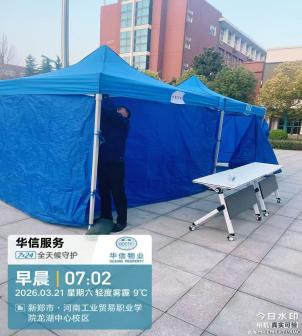 服务点位规范搭建:在校园广场等核心区域,高标准搭建候考帐篷、更衣区、咨询服务台,配齐桌椅、遮阳挡雨设施,为考生提供舒适的候考、休整空间。人员培训全面到位:组织参与保障的物业员工开展专项培训,明确引导流程、服务礼仪、应急处置要求,确保全员以专业状态投入保障工作。考试期间,华信物业全员在岗、全程值守,构建“全方位、无死角”的保障体系: 秩序引导规范高效:在教学楼入口、考场通道等关键点位安排专人值守,设置清晰指引标识,引导考生有序入场、分流通行,保障考场周边秩序井然,杜绝拥堵混乱; 应急保障随时响应:安排工程人员全程在岗待命,快速处置水电故障、设施异常等突发情况,同步做好考场周边环境管控,杜绝噪音干扰,保障考试环境安静有序。