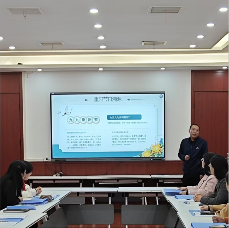 一、溯源重阳,感悟文化深邃活动伊始,基础部副书记付中上为大家介绍了重阳节的起源与文化内涵。他提到,重阳节源自古代对天象的崇拜,后逐渐演变为登高望远、赏菊饮酒、佩茱萸的节日,更承载着尊老敬老、感恩亲情的深厚情感。付书记的讲解,让在场师生对重阳节有了更深刻的理解,也为接下来的诗词朗诵奠定了文化基调。