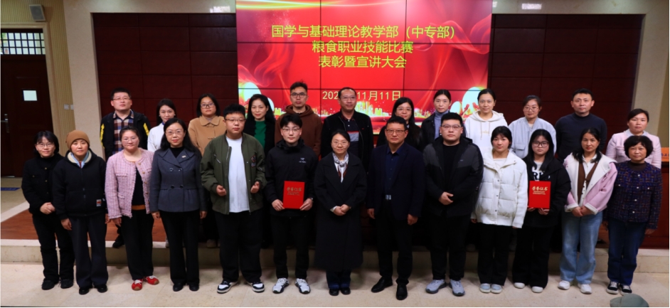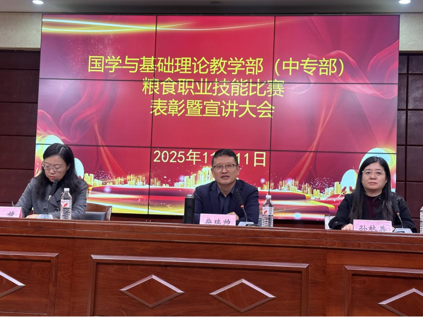 2025年11月11日下午,国学与基础理论教学部(中专部)在3号教学楼3101教室隆重召开粮食职业技能比赛表彰暨宣讲大会。学校党委副书记柴瑞帅、直属党支部书记孙秋英、基础部主任李婕及基础部全体师生参加。大会由直属党支部书记孙秋英主持。