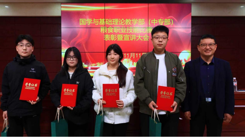 在庄严的国歌声中,表彰大会正式拉开帷幕。李婕首先通报了第七届全国粮食行业职业技能竞赛的获奖情况:粮油质量检验员职业(工种)中职学生组比赛中,邓雨馨荣获一等奖,穆圣涛获三等奖;粮油保管员职业(工种)中职学生组比赛中,司润飞斩获一等奖,翟燕歌获二等奖。李婕向获奖同学表示热烈祝贺,并号召全体同学以他们为榜样,明确目标,砥砺前行。随后,校党委副书记柴瑞帅为获奖学生颁发奖状,现场掌声雷动。
