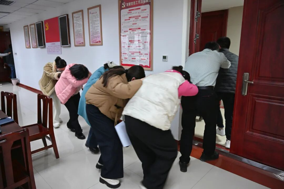 视频学习环节落幕,演练指令随即下达,全体教师迅速响应,按照预设疏散路线弯腰低姿前行,以湿毛巾捂住口鼻避开烟雾模拟区域,沿途听从引导员指令有序避让、快速衔接。整场逃生演练中,教师们动作规范、配合默契,在规定时间内全部安全抵达指定集合点,充分展现出良好的应急处置素养与协作能力,切实检验了逃生技能掌握成效。演练结束后,侯远韶作总结讲话,他强调本次安全应急演练培训