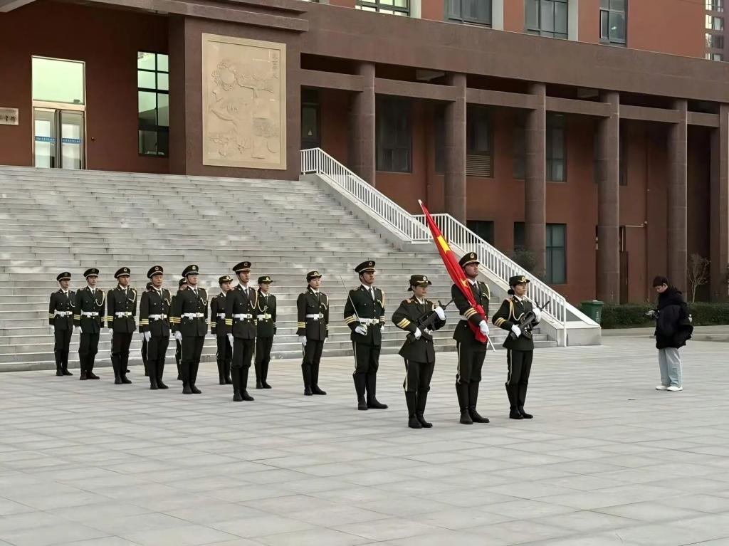 朝阳初绽,学院师生整齐列队,以饱满的精神状态等待仪式开始。国旗护卫队迈着铿锵步伐,护送国旗至旗杆下,随着庄严的《义勇军进行曲》奏响,五星红旗冉冉升起,全体师生向国旗行注目礼,歌声激昂,传递着对祖国的崇敬与热爱。