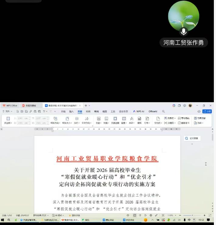为深入贯彻落实教育部及学校关于毕业生就业工作的部署要求,充分抢抓寒假就业服务窗口期,2016年1月24日粮食学院通过腾讯会议召开2026届毕业生“寒假促就业暖心行动”暨“优企引才”定向访企拓岗促就业专项行动动员部署会。学院领导班子、教研室主任及就业专干参会。