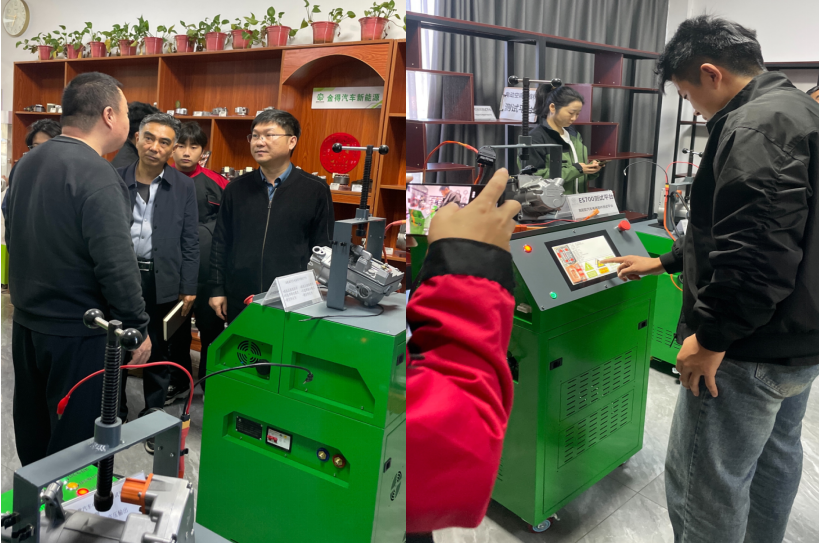 交流伊始,金得汽车科技刘总经理带领学院一行参观了企业核心维修车间,涵盖动力电池、电机、压缩机及整车维修等关键领域。在压缩机维修车间,刘永福现场演示了企业自主研发的智能检测设备,通过数据化分析精准定位故障点,展现了技术创新的硬实力;在整车维修车间,团队观摩了新能源汽车高压系统维修流程,企业技术人员详细讲解了安全操作规范与行业痛点解决方案。参观过程中,学院师生与企业工程师频繁互动,就设备操作细节、技术难点展开深入探讨。