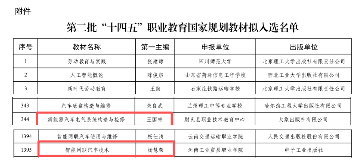 近日,从教育部职业教育与成人教育司传来喜讯,汽车工程学院杨慧荣老师主编的《智能网联汽车技术》与王国彬老师主编的《新能源汽车电气系统构造与检修》两本教材,成功入选第二批 “十四五” 职业教育国家规划教材公示名单,标志着学院教材建设工作取得历史性突破!
