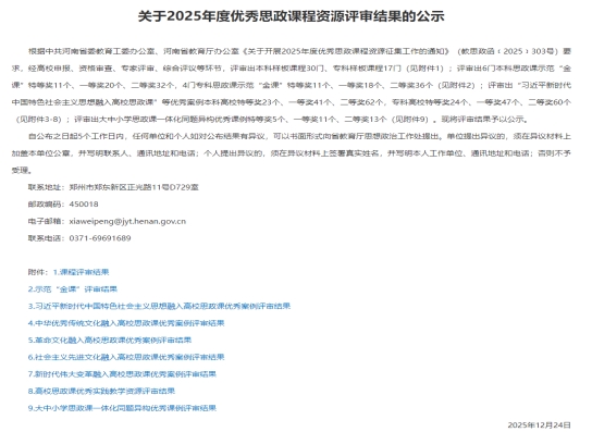 25.12月24日,在2025年度全省优秀思政课程资源评选中获示范“金课”二等奖1项,优秀案例特等奖1项、一等奖4项、二等奖1项。