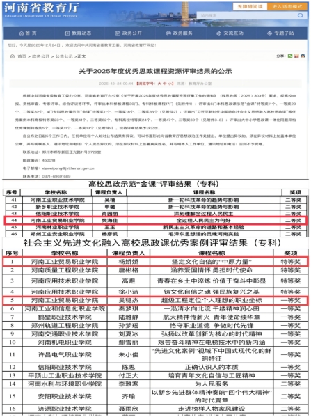 近日,河南省教育厅官网公布了《关于2025年度优秀思政课程资源评审结果的公示》,我院参赛项目在高校思政示范“金课”评审结果中获二等奖1项;在“习近平新时代中国特色社会主义思想融入高校思政课”等优秀案例评审结果中获特等奖1项、一等奖4项,二等奖1项。