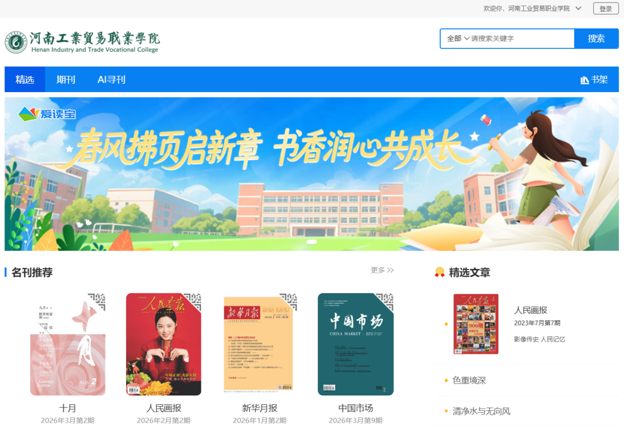 爱读宝数字阅读平台,针对高校、图书馆及大型团体的数字报刊阅读需求特点,建设研发的服务于各类B端市场的一体化报刊数字化阅读系统及建设方案。爱读宝致力于为河南工业贸易职业学院的全体师生提供全资源、多终端、重运营的跨平台数字阅读服务。