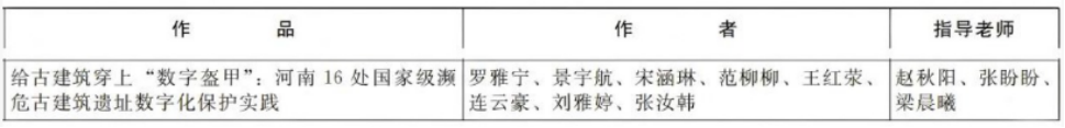 自赛事启动以来,我校党委高度重视,团委牵头统筹,各二级学院积极响应,组建专家团队,从作品选题、方案设计、研究论证到答辩展示,为参赛学生提供全流程精准指导。其中,由赵秋阳、张盼盼、梁晨曦三位老师指导的参赛作品《给古建筑穿上“数字盔甲”:河南16处国家级濒危古建筑遗址数字化保护实践》斩获特等奖。
