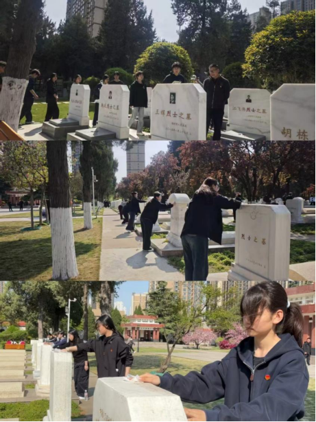 活动现场庄严肃穆,英烈墓碑静静矗立,诉说着革命先辈们浴血奋战的峥嵘岁月。研学活动仪式由学生党支部书记夏文龙主持,他首先强调了此次研学活动的意义,号召全体入党积极分子以英烈为榜样,传承英烈精神,坚定理想信念。随后,优秀学生代表发表讲话,结合自身成长经历与入党初心,表达了对革命先烈的深切缅怀和崇敬之情。仪式结束后,在夏文龙书记的带领下,全体入党积极分子有序向烈士纪念碑敬献鲜花,寄托对英烈的哀思与敬意;随后,学子们小心翼翼地擦拭着每一块烈士墓碑上的尘埃,用实际行动表达对英烈的缅怀与敬仰。最后,全体人员肃立默哀,向革命英烈深深鞠躬,以此致敬那些为民族独立、人民解放献出宝贵生命的英雄。