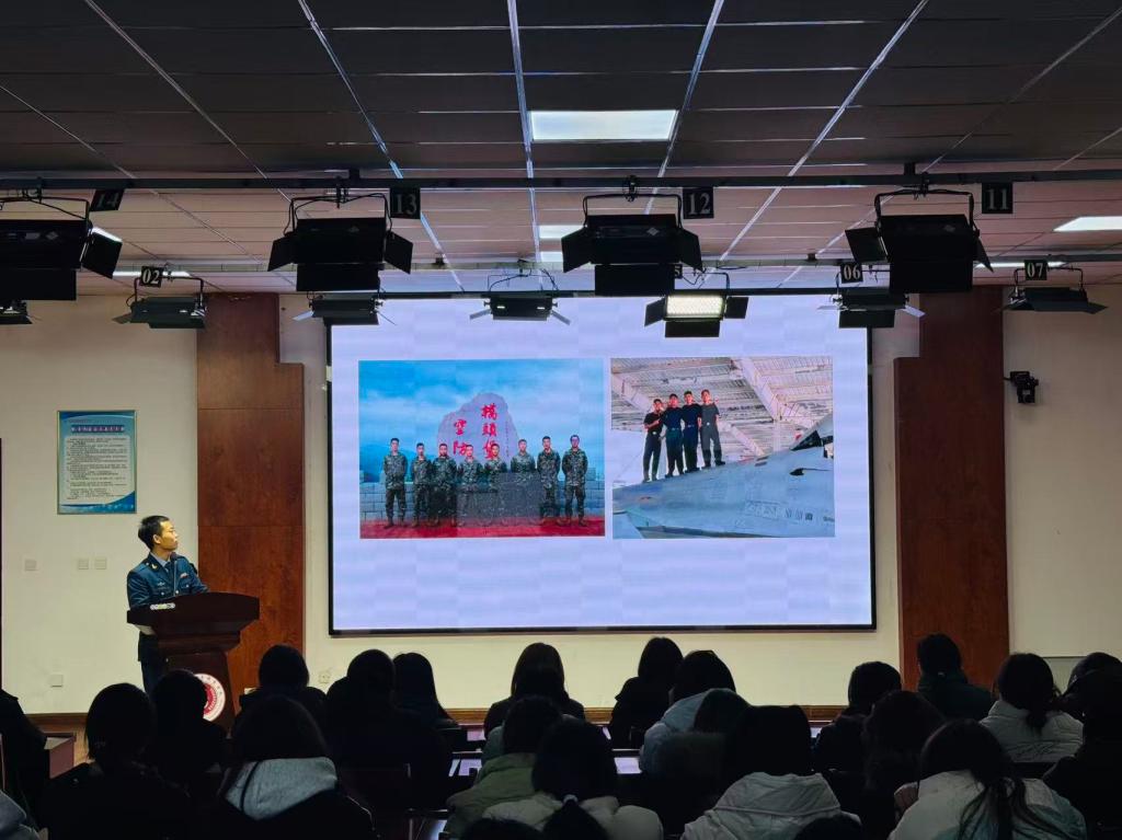 商业贸易学院的姚晓凯围绕《三负责精神——以青春笃行致远》展开分享,作为曾服役于国防部授予“海空雄鹰团”的海军战士,他2019年入伍以来常年执行战备任务,保障战斗起飞百余次、安全飞行千余架次,所在单位三次荣获“集体三等功”。他以“忠诚善战,气霸海空”的宣言,传递了军人的坚毅品格与奉献精神,让同学们对军营战备生活有了更真切的认识。