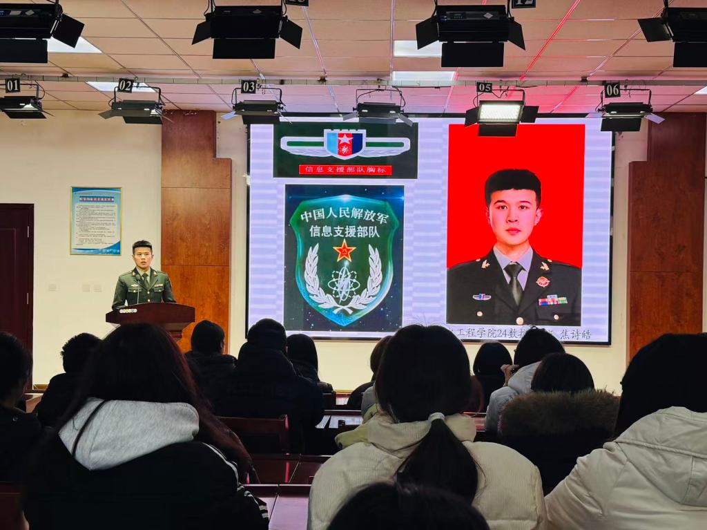 机电工程学院的焦诗皓以《五年军旅——一名普通大学生到一名合格军人的青春蜕变》为题,讲述了自己2019年入伍至2024年退役的五年军旅生涯。从新兵到维护员、炊事员、班长等多个岗位的历练,从“优秀新兵”到“四有”优秀士兵的荣誉积淀,他用“携笔从戎,立志报效家国;退役复学,继续发光发热”的誓言,展现了普通大学生在军营中的成长与蜕变,让同学们深刻体会到军旅生活对意志品质的锤炼。