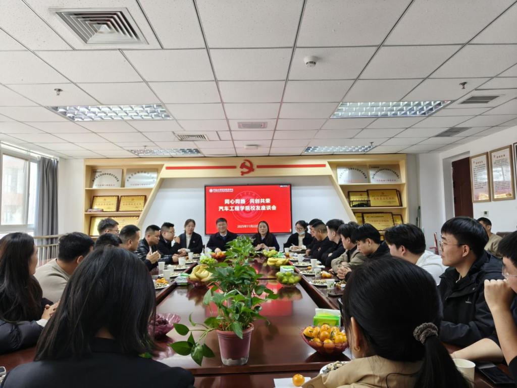 七十五载耕耘不辍,工贸沃土硕果盈枝。值此校庆之际,汽车工程学院于2025年11月22日,在图书馆B902隆重举行了以“同心同路 共创共荣”为主题的校友座谈会。汽车工程学院各界校友和在校师生代表近50人出席了座谈会,共同追忆青春岁月、重温师生情谊、共商母校发展。座谈会由汽车工程学院党总支书记陈冰赛主持。