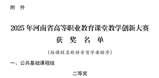 近日,河南省教育厅办公室发布了《关于公布2025年河南省高等职业教育课堂教学创新大赛获奖名单的通知》(教办职成〔2026〕19号),我院教师史璐雅荣获公共基础课程组二等奖。