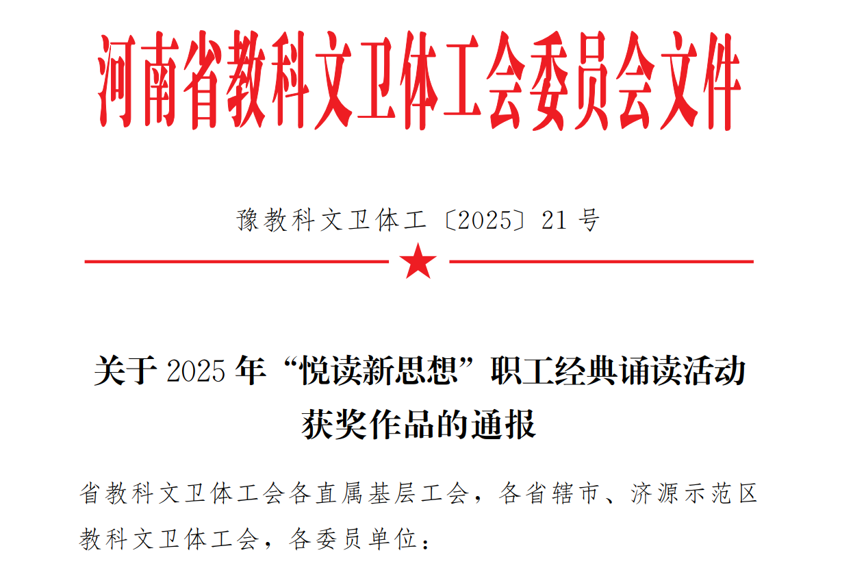 11月6日,我校作品《一粒种子的承诺———袁隆平精神的时代传承》获河南省总工会2025年“悦读新思想”河南省职工经典诵读活动长视频类优秀奖。