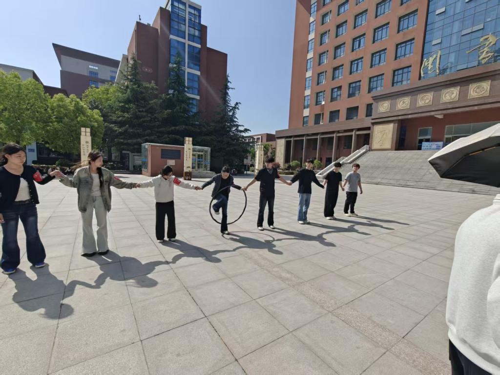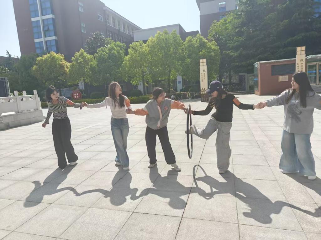 携手奋进:呼啦圈穿越人墙,不能松手、不能辅助,充分展现团队凝聚力。