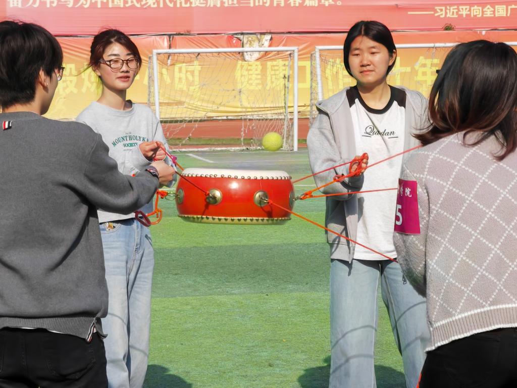 同心击鼓:八人共拉鼓绳,让球在鼓面连续弹起,默契配合是胜利的关键。