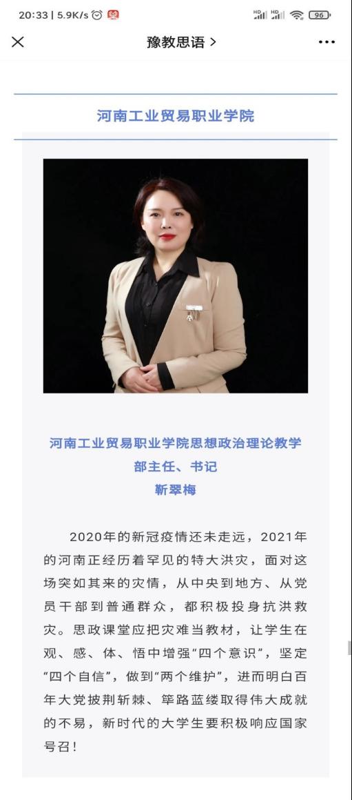 7月29日,靳翠梅应河南省教育厅思政处“豫教思语”约稿,作为河南33位高校马克思主义学院院长之一,就如何讲好防汛救灾这堂思政大课发表了自己的见解。