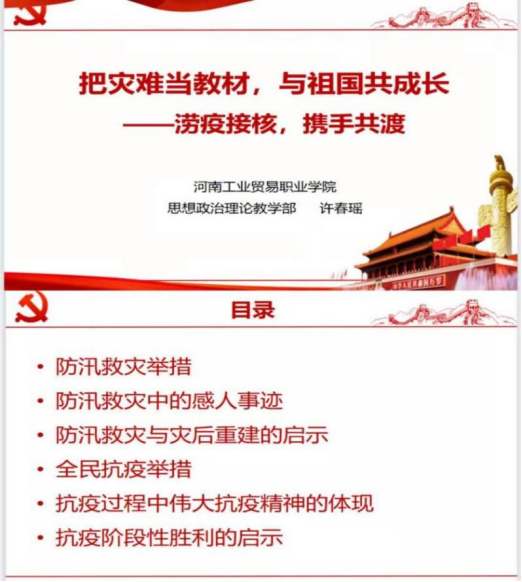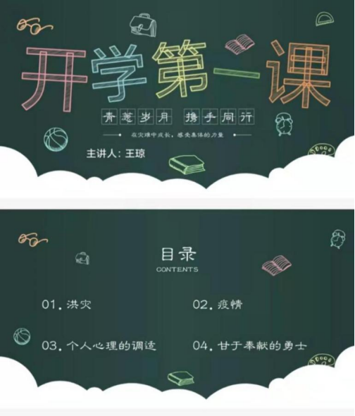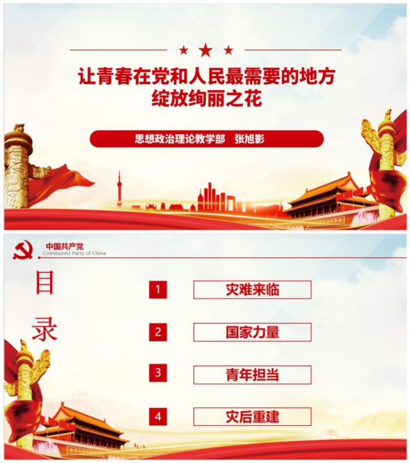 在前期选题的基础上,思政课教师认真备课,制作精美的课件,把社会大课堂融入思政小课堂,运用鲜活的“灾难教材”阐述“中国共产党为什么能”“马克思主义为什么行”“中国特色社会主义为什么好”。下面,我们就来先睹为快吧!