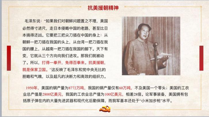每当听到这首铿锵有力的《中国人民志愿军军歌》,耳边就会响起毛泽东主席那句“打得一拳开,免得百拳来。抗美援朝,就是保家卫国。”的战略判断。新生的中华人民共和国面对强敌,以“钢少气多”的英雄气概打赢了一场实力完全不对等,似乎没有一点胜算可能的抗美援朝战争。