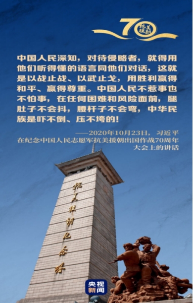 “一个有希望的民族不能没有英雄,一个有前途的国家不能没有先锋。”“崇尚英雄才会产生英雄,争做英雄才能英雄辈出。”硝烟虽然散尽,但伟大的抗美援朝精神将激励中国人民奋勇向前!
