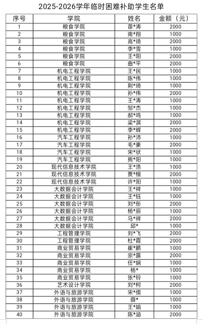 河南工业贸易职业学院 关于2025-2026学年临时困难补助学生名单的公示