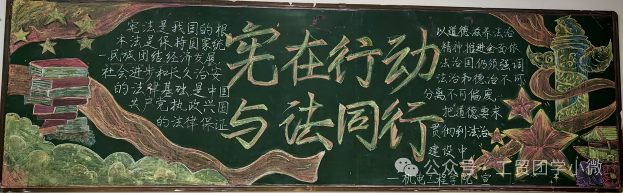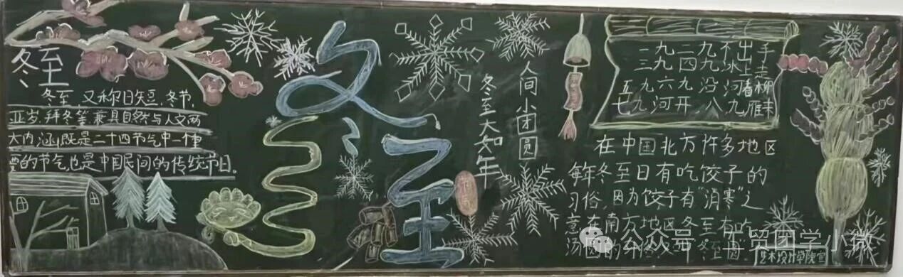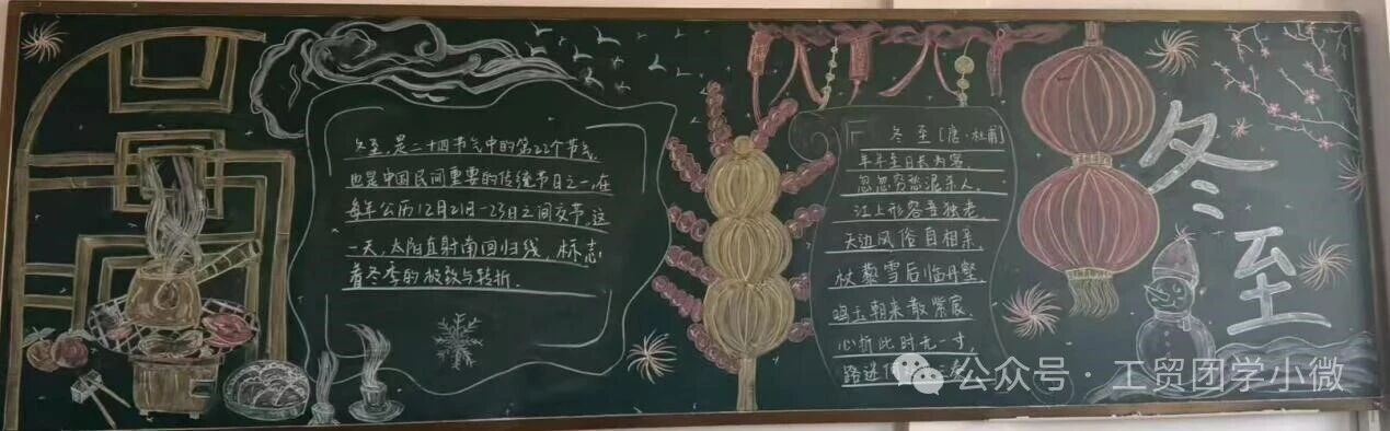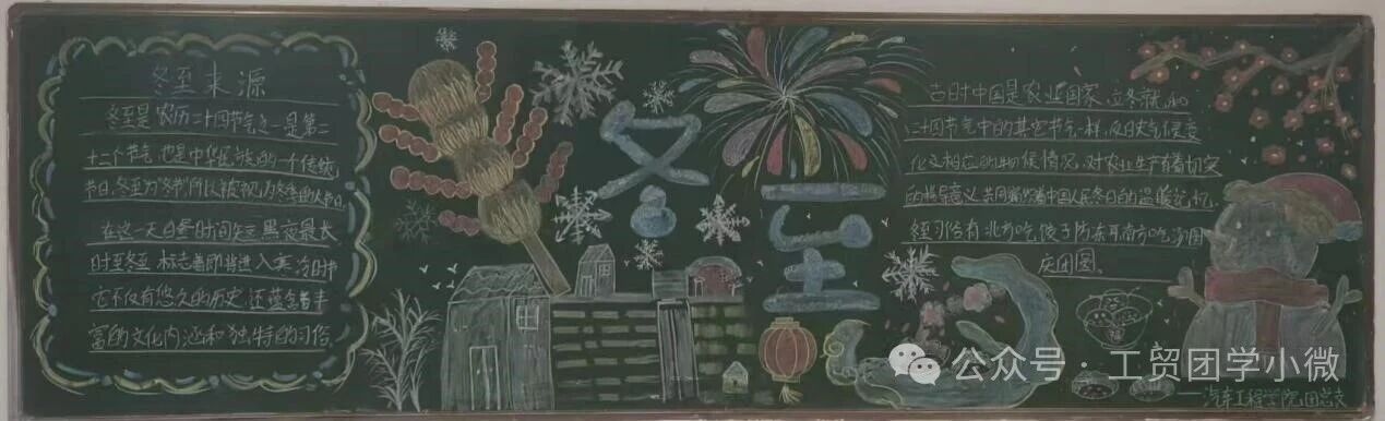 本次活动设置冬至民俗文化与宪法精神宣传两大主题,各二级学院学生自主选题、精心构思。创作的过程,同学们以冬至民俗元素在黑板上勾勒出冬日的温情画卷;学校也借助板报活动向学子弘扬宪法精神、播撒法治种子,为社会主义法治文化建设注入青春血液。
