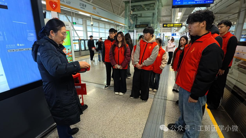 活动中,地铁站工作人员热情讲解,通过“理论讲授+现场演示+实践操作”模式,为同学们科普地铁服务规范、安全乘车知识,还现场演示AED自动除颤仪等应急设备的使用方法并邀请同学们体验。在互动交流环节,工作人员针对志愿者提出的乘客引导、突发事件处置等问题逐一解答,分享了地铁服务中的暖心故事与实用经验。