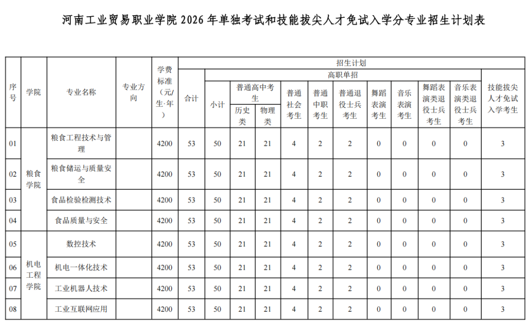 (一)学校2026年单独考试招生计划为1650人,分类别分专业招生计划详见《河南工业贸易职业学院2026年单独考试和技能拔尖人才免试入学分专业招生计划表》(附后)。