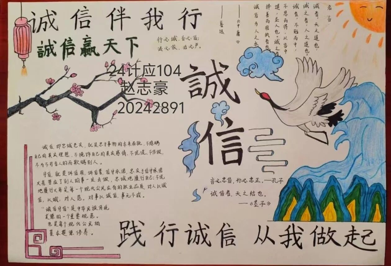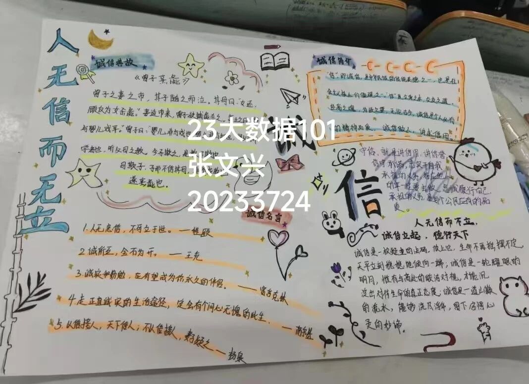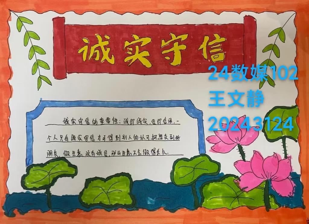 本次诚信教育活动不仅是一次思想教育的洗礼,更是一次心灵的触动。它让同学们在创作和交流中深刻体会到诚信的力量和价值,培养了他们的诚信品质和道德素养。通过手抄报展示这一形式,活动将诚信教育与艺术创作相结合,激发了学生的学习兴趣和参与热情,使诚信教育更加生动、有趣、富有感染力。