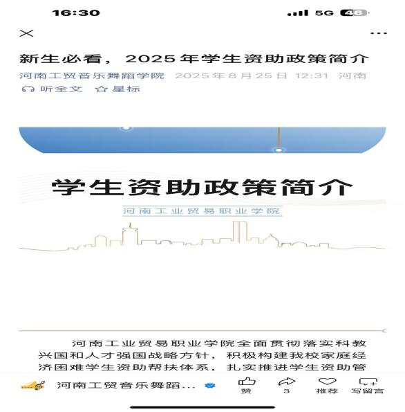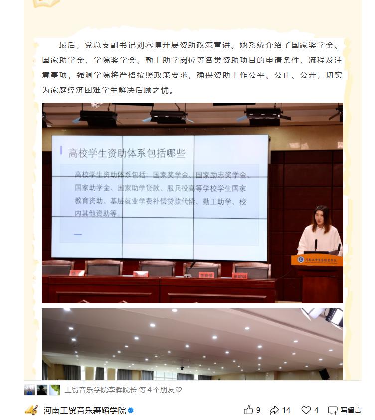 一是打造云端宣传矩阵,提升资助政策传播效能。1.依托学院官网、微信公众号等平台优势,开展线上政策宣传,对国家资助政策进行深度解读,重点围绕国家奖学金、国家励志奖学金、国家助学金、国家助学贷款(含生源地贷款)等核心内容展开;2.建立“学院—班级”二级信息传递机制,将政策解读内容同步转发至学院、班级微信工作群,通过教师实时答疑、解读政策要点等方式,确保全院师生均能准确理解政策精神。