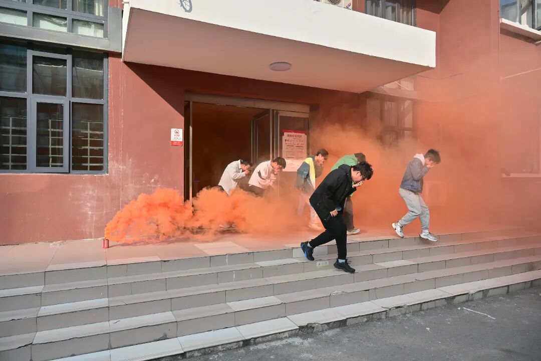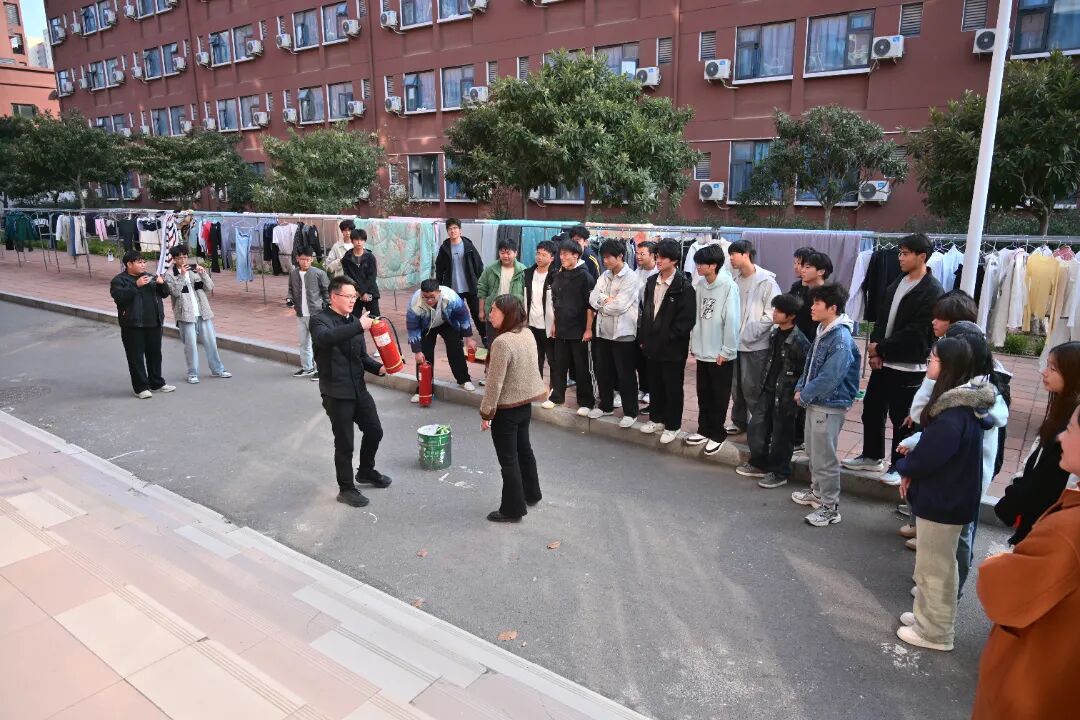 讲座结束后,实战演练紧锣密鼓开展。演练在学生公寓2号楼模拟“宿舍起火”应急情境,一、二层学生在楼管员与辅导员的引导下,按照“快速、有序、安全”原则,沿楼梯紧急疏散至大门口。整个演练过程紧张有序、反应迅速,充分检验了师生的应急处置能力,达到了“以练促学、以练促防”的预期目标。