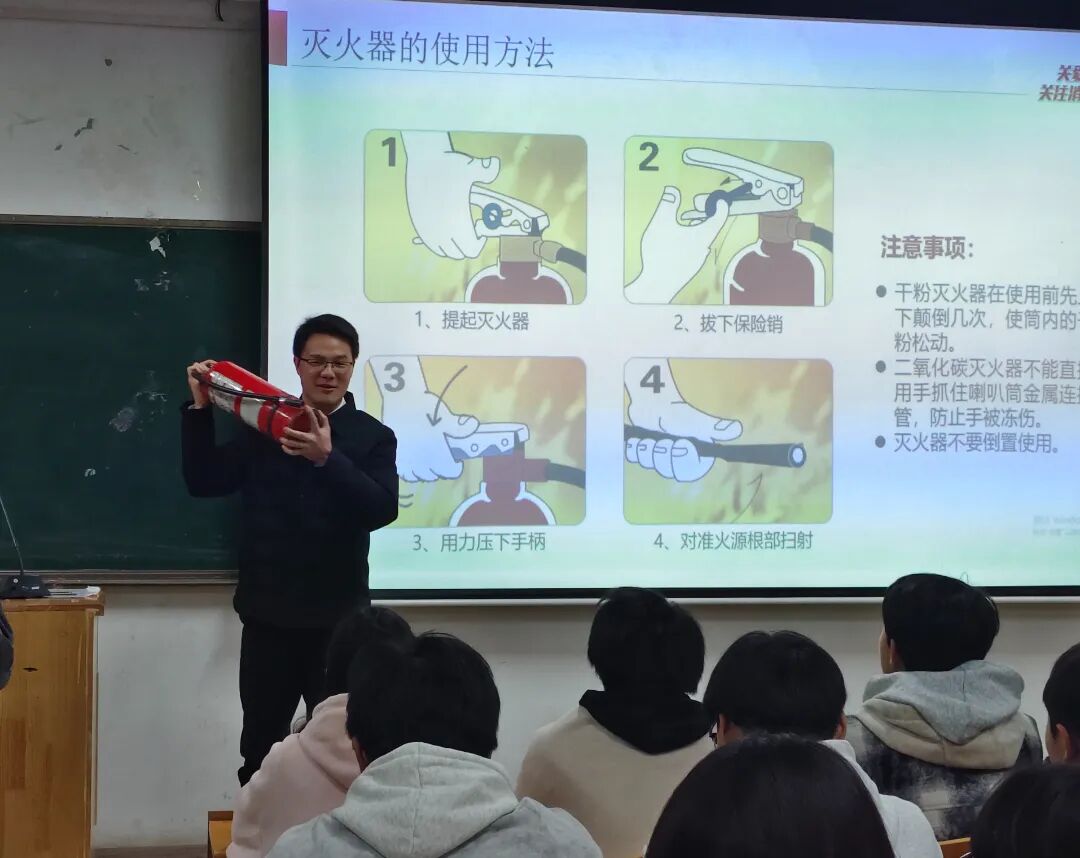 讲座现场,以“校园消防安全”为主题。围绕“发现险情如何报告、怎样正确使用灭火器、 火灾发生后怎样安全疏散逃生”三个层次进行理论和实操授课。